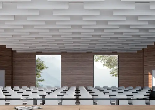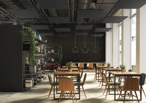 Dit technische product wijkt in vorm en uitstraling af van onze overige panelen. In prestaties is het echter vergelijkbaar. Bijkomend voordeel is dat Industrial voordelig geprijsd is. Deze collectie geluidsabsorberende panelen met hoge akoestische prestaties (geluidsabsorptieklasse A) is ontworpen om toepasbaar te zijn voor grootschalige projecten in scholen en commerciële en industriële omgevingen. De panelen zijn gemaakt van polyester met variabele dichtheid, zonder externe bekleding. Met behulp van diverse steunen kunnen de panelen worden bevestigd aan het plafond, aan de muur of opgehangen via kabels. Industrial heeft het Greenguard certificaat verkregen omdat het voldoet aan de strenge eisen voor chemische uitstoot.