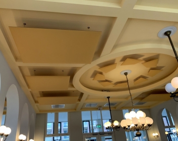 Bij deze mooie twee-lokatie zorginstelling met een eeuwenoude geschiedenis, was de spraakverstaanbaarheid in de Brasserie als gevolg van de architectuur in combinatie met de hoge ruimte niet optimaal. Door het ophangen van Oversize Ceiling plafondeilanden en Flap panelen aan het plafond heeft de ruimte een nog huiselijker karakter gekregen en is de nagalmtijd zeer goed merkbaar verlaagd. Zo kunnen de gebruikers elkaar weer beter verstaan en nog meer genieten van de sfeer in deze prachtige ruimte.