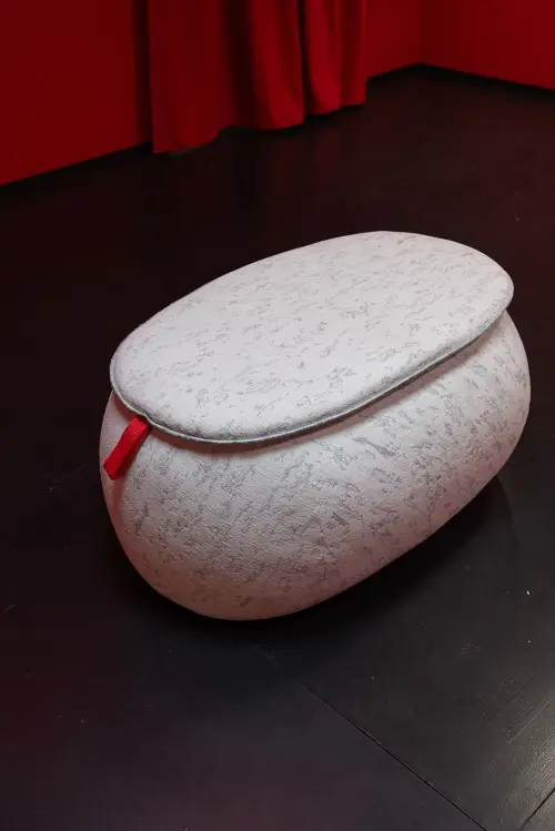 Een Snowpouf is niet alleen een object om op te zitten maar ook een waardevolle bondgenoot tegen ongewenst geluid. Dit dankt dit bijzondere zitmeubel aan de bekleding met Snowsound Fiber een zeer speciale en gepatenteerde geluidsabsorberende stof. Ontwerpster Paola Navone liet zich naar eigen zeggen inspireren door de ton vorm van een Chinese trommel. Verder omschrift ze Snowpouf als volgt; "De Snowpouf is een stoel met een vrolijk soort popart-spirit maar ook met een verrassend vermogen om geluiden te dempen".