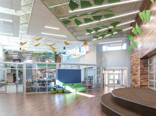 V-Flap is een zeer bijzondere variant op een akoestisch baffle systeem. De twee gekoppelde tweezijdig akoestische panelen zijn licht van gewicht en zijn geproduceerd volgens de unieke Snowsound technologie. Het paneel is opgebouwd uit polyester vezels en heeft verschillende dichtheden. Dit zorgt voor een optimale selectieve geluidsabsorptie binnen een groot frequentiebereik. Ook in grote ruimten zoals trappenhuizen en vides van grote gebouwen zijn de absorbtieresultaten indrukwekkend. Met V-Flap lossen wij in hoge ruimten gegarandeerd akoestische problemen op.