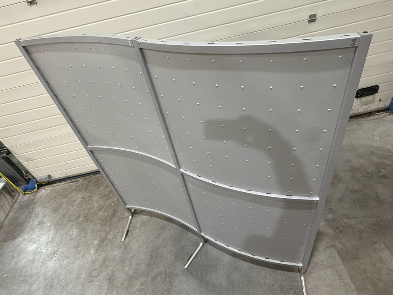 Showroommodel Pli akoestisch scherm van Snowsound®, bestaande uit 3 geluidsabsorberende panelen van elk 59 x 159 cm, gekoppeld met elastische banden. Dankzij dit flexibele systeem kunnen de panelen in verschillende hoeken geplaatst worden, zodat het scherm eenvoudig kan worden aangepast aan de ruimte en de gewenste akoestische werking.