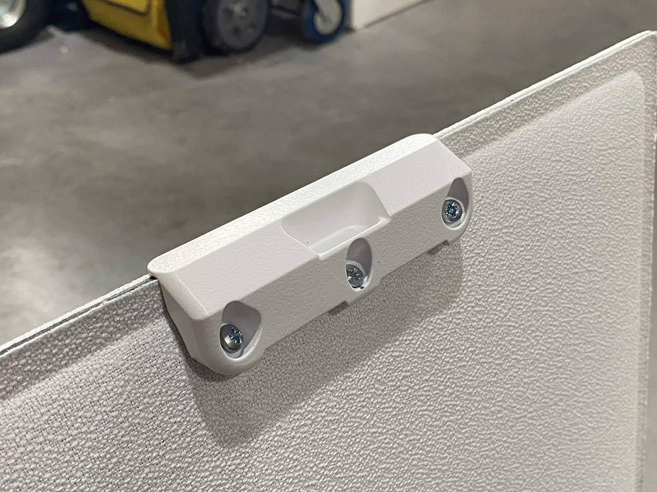 De panelen worden met verchroomde metalen klemmen aan de wand bevestigd. Deze zijn uitgerust met speciale veren die de constructie een subtiele elasticiteit geven. Hierdoor kan zowel de afstand tot de wand als de hoek van de panelen worden aangepast. Zo kan het geluidsabsorptieniveau van elke configuratie optimaal worden afgestemd op de akoestische eisen van de ruimte.