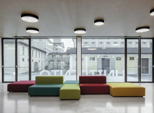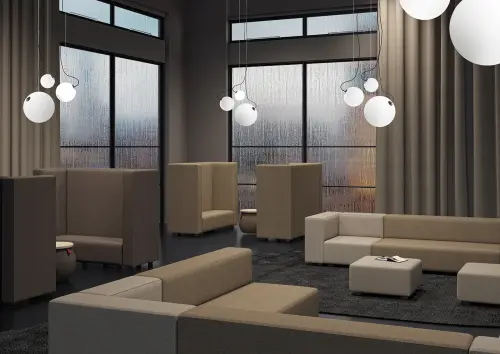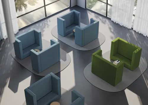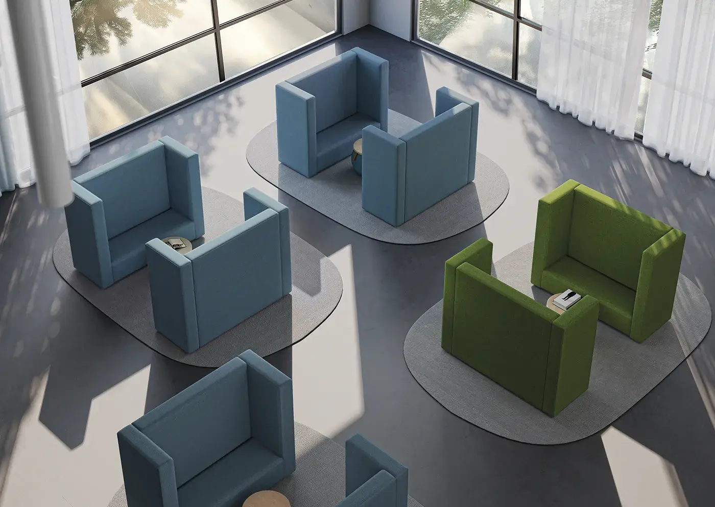 Het weelderige lijnenspel van in combinatie met de rijke vulling van onze akoestische sofa's zorgt ervoor dat het volledige voordeel wordt behaald uit de Snowsound-Fiber technologie, de basis van de akoestische meubelbekledingsstof.